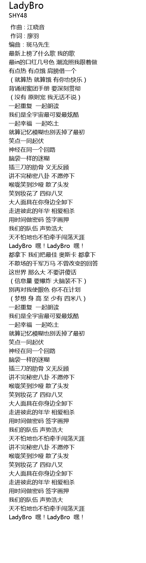 | [03:26.95] | LadyBro hei! LadyBro hei! |