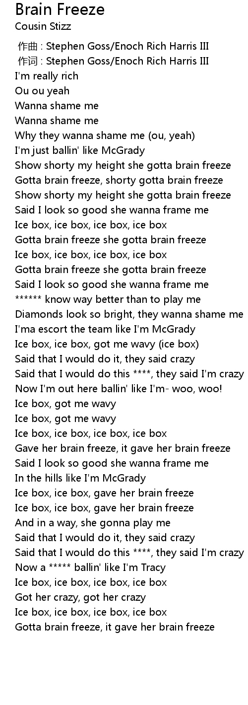 | [00:48.64] | Gotta brain freeze she gotta brain freeze |