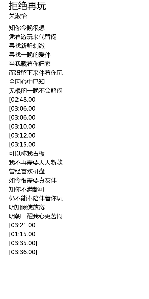 | [03:31.00][03:15.00][02:58.00][02:26.00][02:09.00][01:12.00] | 在某天已拒绝再玩 |
