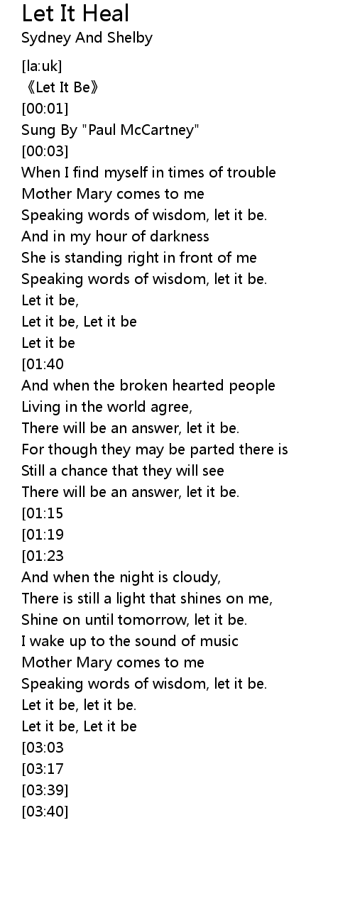 | [02:26][01:40][00:40] | Whisper words of wisdom, let it be. |