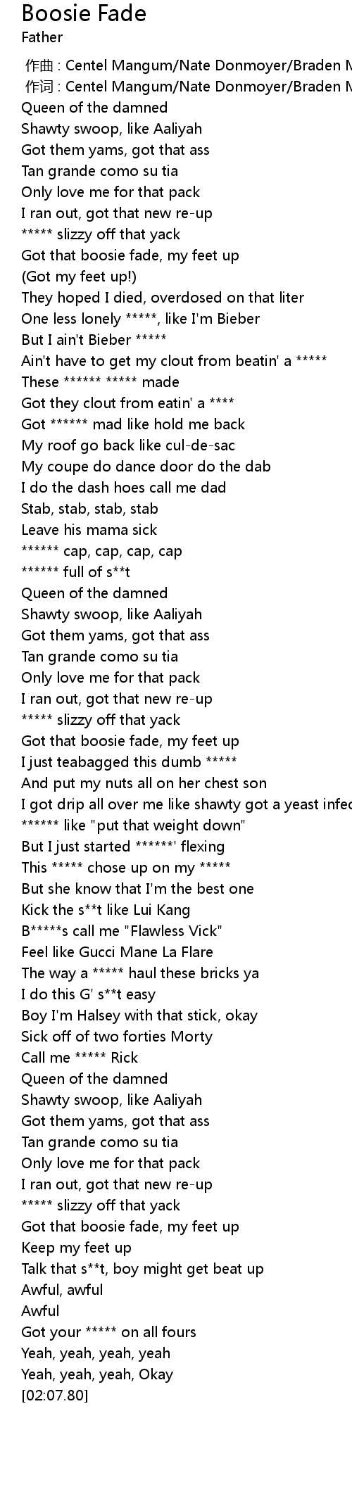 | [00:24.42] | Got that boosie fade, my feet up |