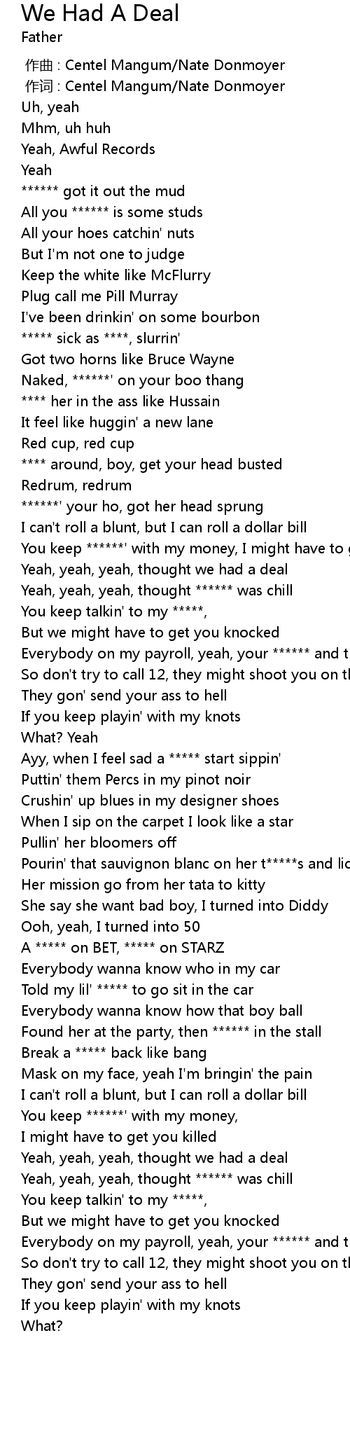 | [01:45.57] | Yeah, yeah, yeah, thought we had a deal |
