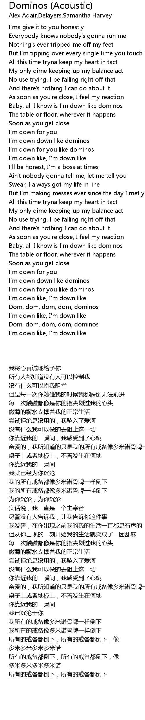 Baby, all I know is I'm down like dominos |