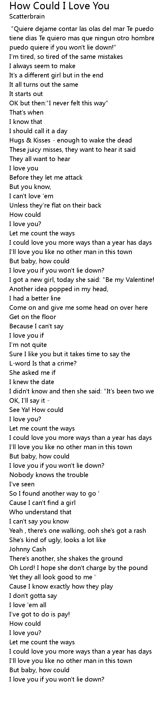 [Brogna] "Quiere dejame contar las olas del mar Te puedo quiero mas que un ano tiene dias Te quiero mas que ningun otro hombre en la ciudad But baby, como te puedo quiere if you won't lie down!" |