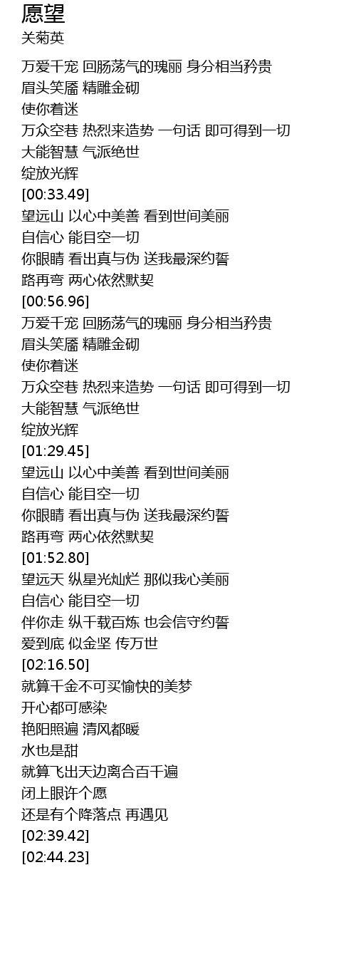 | [00:34.94] | wàng yuǎn shān yǐ xīn zhōng měi shàn kàn dào shì jiān měi lì |