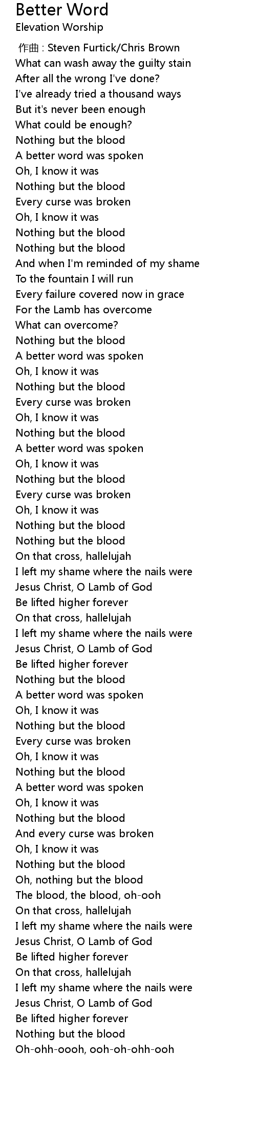 | [00:00.000] | zuo qu : Steven Furtick Chris Brown |