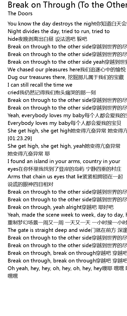 | [00:23.74] | Break on through to the other side yeah chuan yue dao shi jie de jin tou ye |