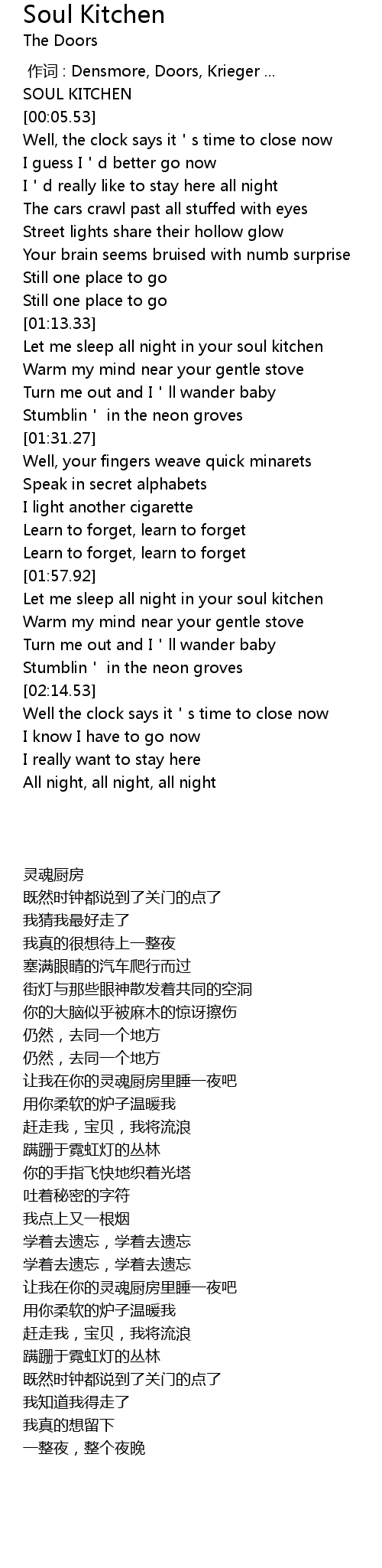 | [01:14.45] | Let me sleep all night in your soul kitchen |