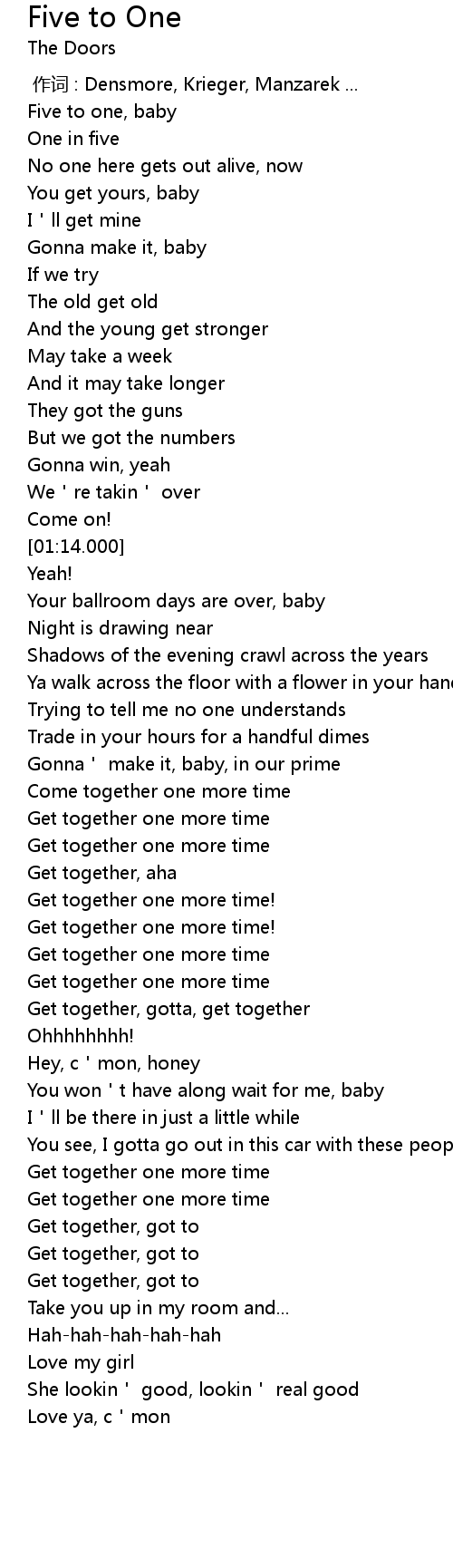 | [00:00.00] | 作词 : Densmore, Krieger, Manzarek ... |