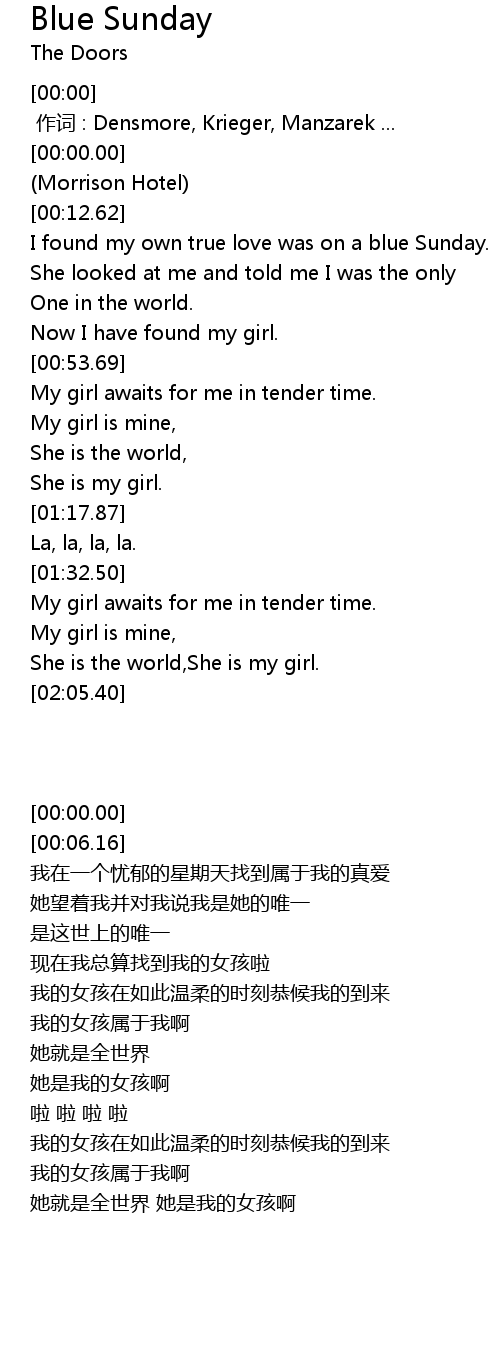 | [00:18.93] | I found my own true love was on a blue Sunday. |