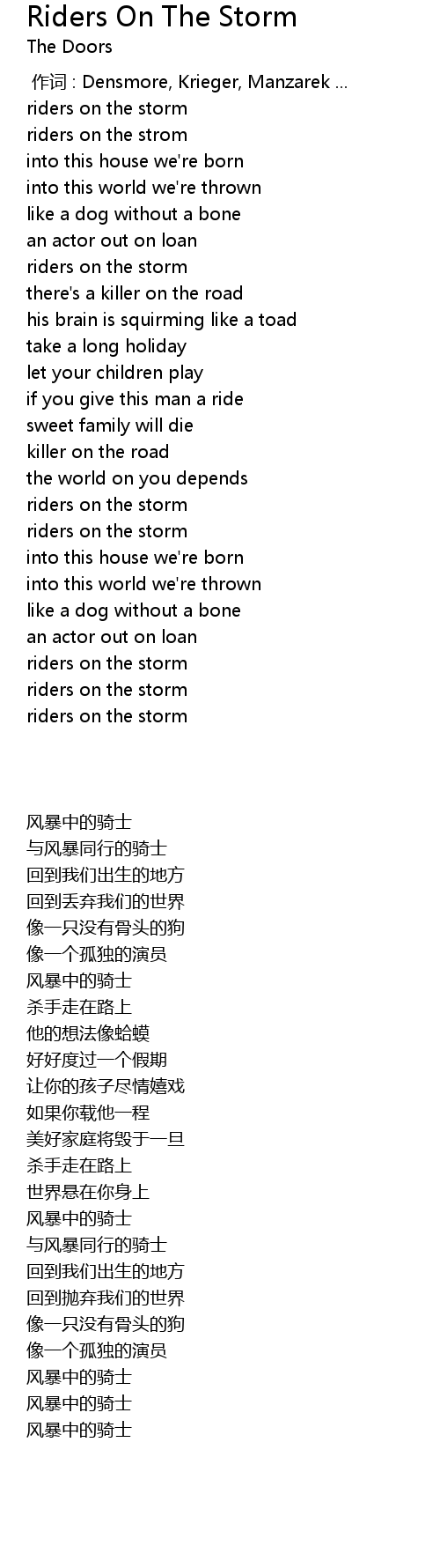 | [00:00.00] | 作词 : Densmore, Krieger, Manzarek ... |