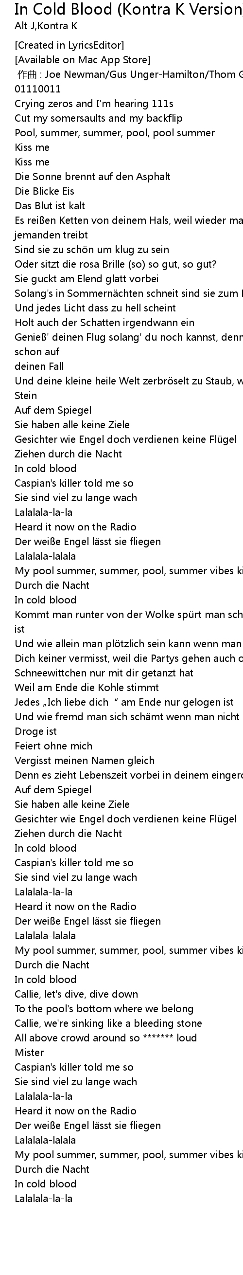 | [00:34.431] | Solang's in Sommernächten schneit sind sie zum Nachdenken zu high |