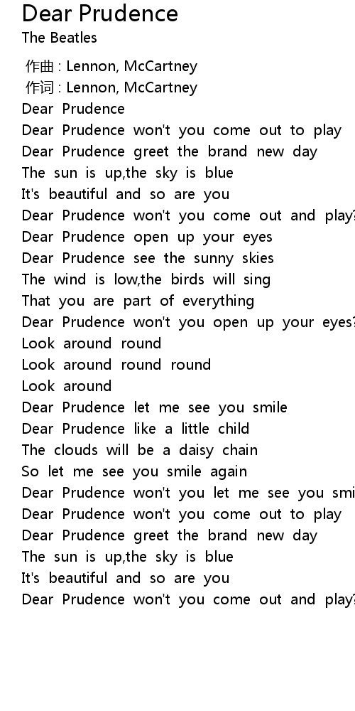 | [00:18.21] | Dear Prudence won't you come out to play |