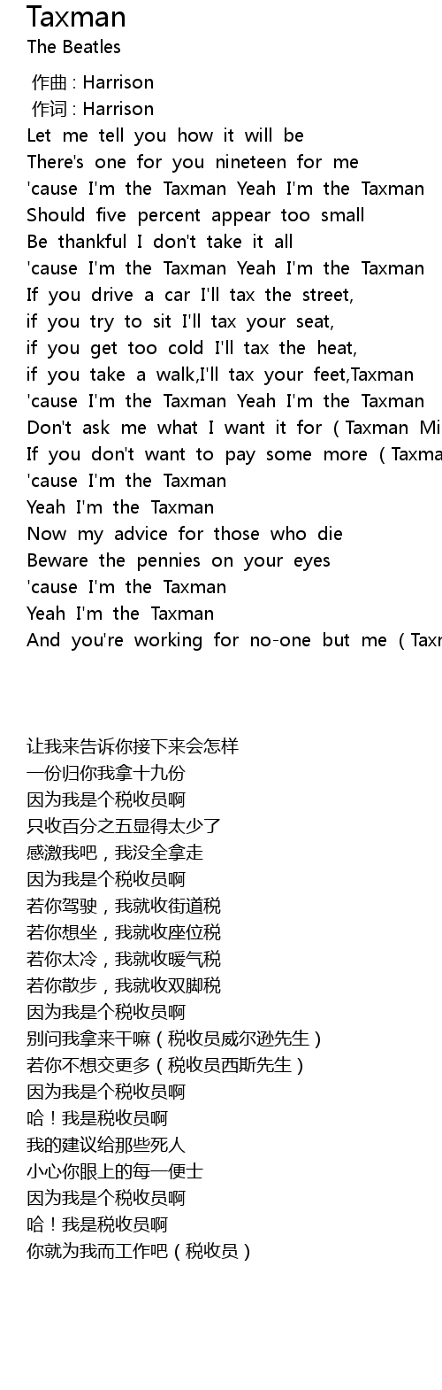 | [00:45.89] | 'cause I'm the Taxman Yeah I'm the Taxman |
