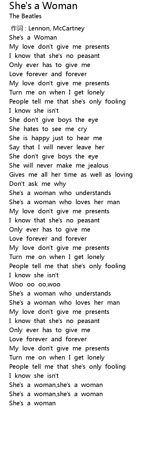 | [02:47.38] | She' s a woman, she' s a woman |