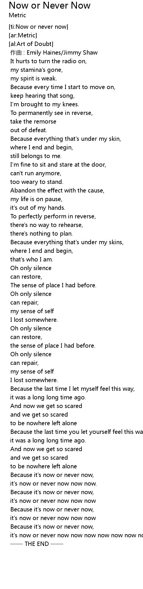 | [05:24:000] | it' s now or never now now now now now now now. |