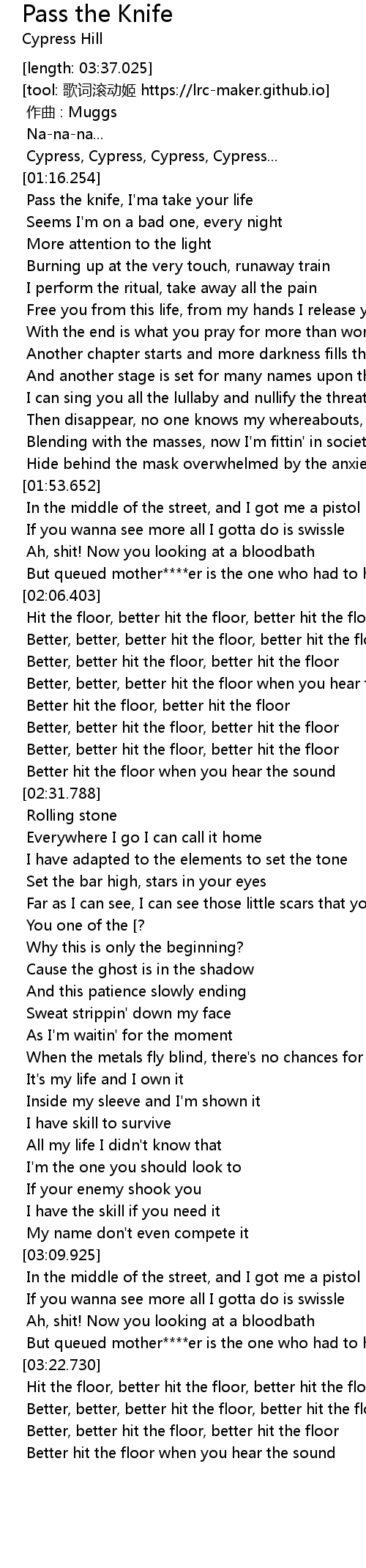 | [01:16.379] | Pass the knife, I' ma take your life |