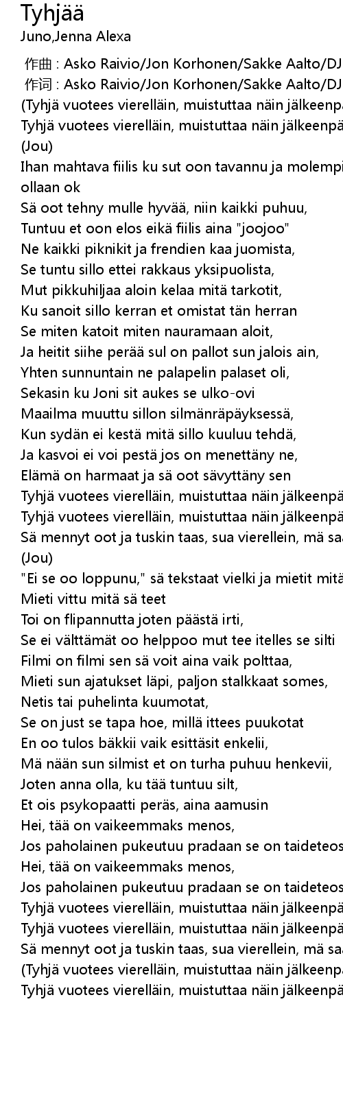| [03:00.97] | Tyhjä vuotees vierelläin, muistuttaa näin jälkeenpäin) |