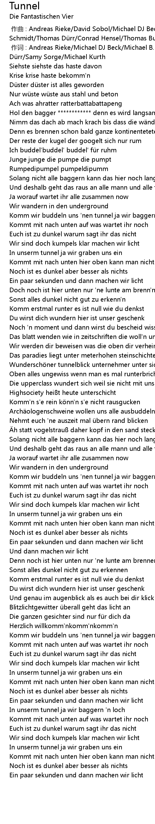 | [03:15.57] | In unserm tunnel ja wir baggern ' n loch |