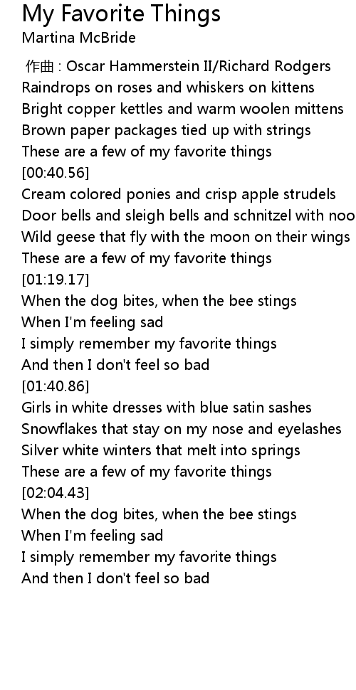 | [00:20.53] | Raindrops on roses and whiskers on kittens |