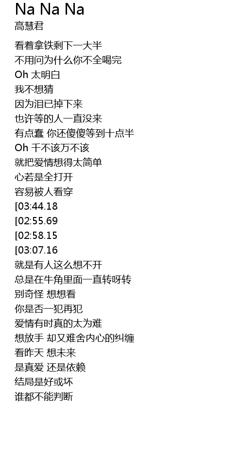 | [03:55.74][03:44.18][03:32.62][03:09.79][02:47.53][02:01.07][01:03.05] | Na Na Na |