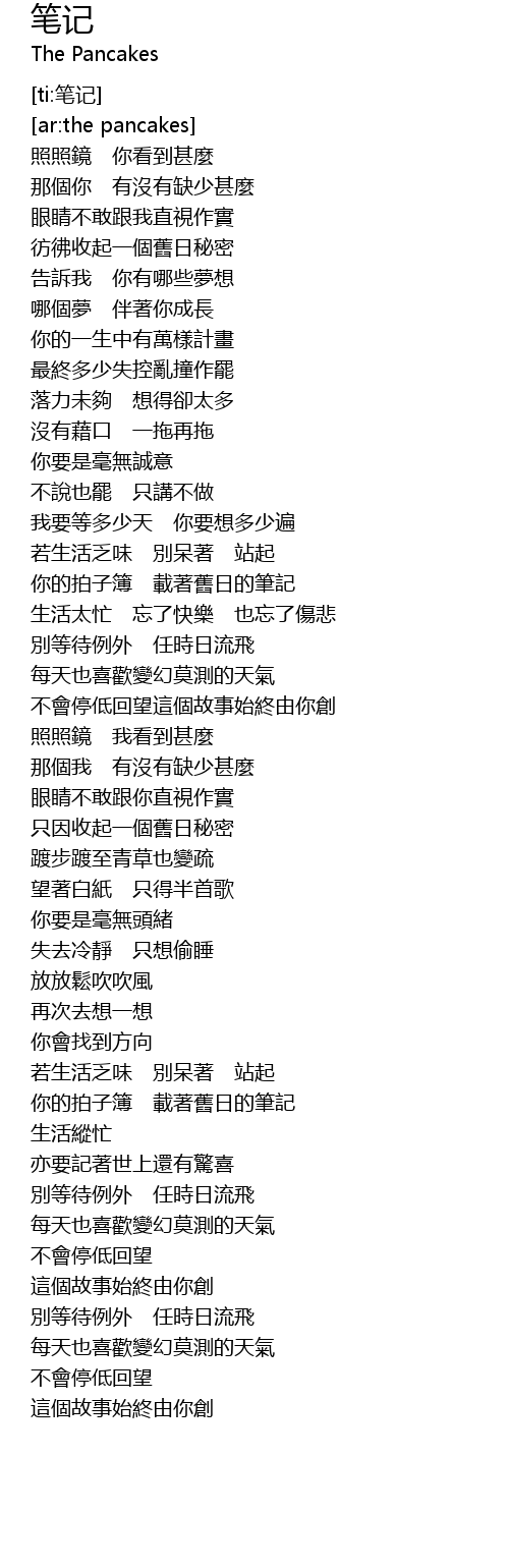 | [02:26.299] | 你的拍子簿 載著舊日的筆記 |