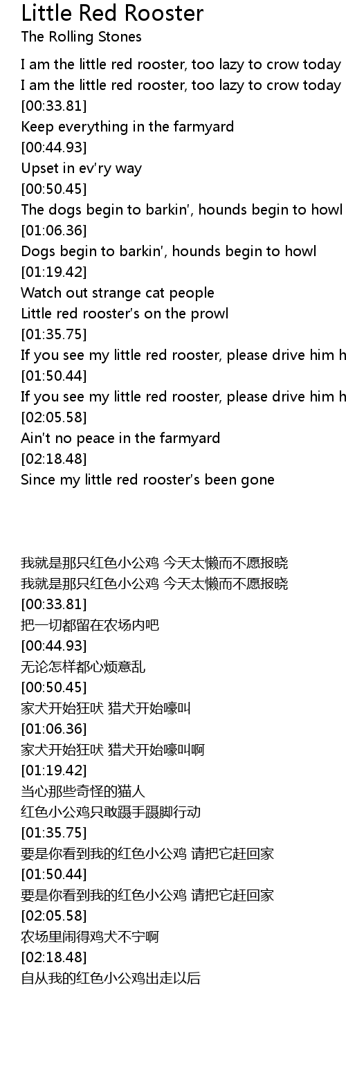 | [01:42.72] | If you see my little red rooster, please drive him home |