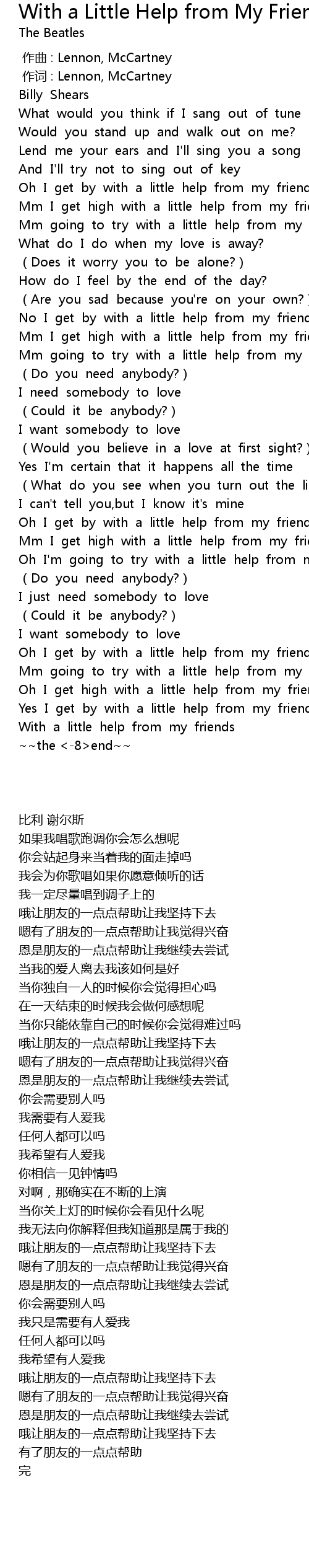 | [01:46.35] | Oh I get by with a little help from my friends |
