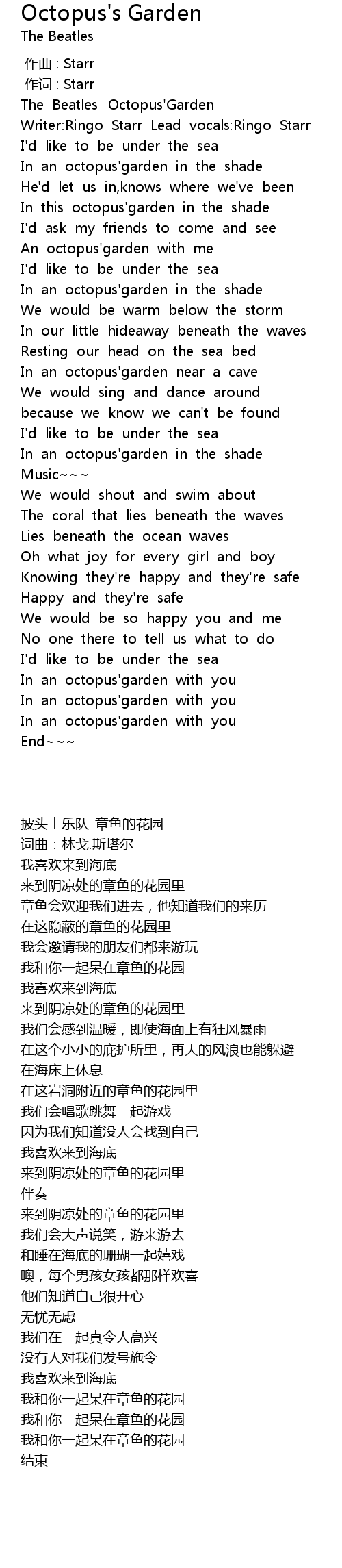 | [00:36.831] | An octopus'garden with me |