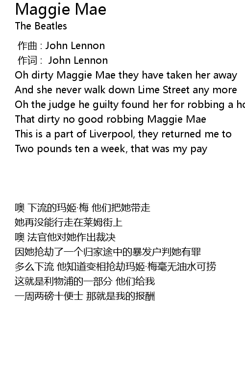 | [00:01.72] | Oh dirty Maggie Mae they have taken her away |
