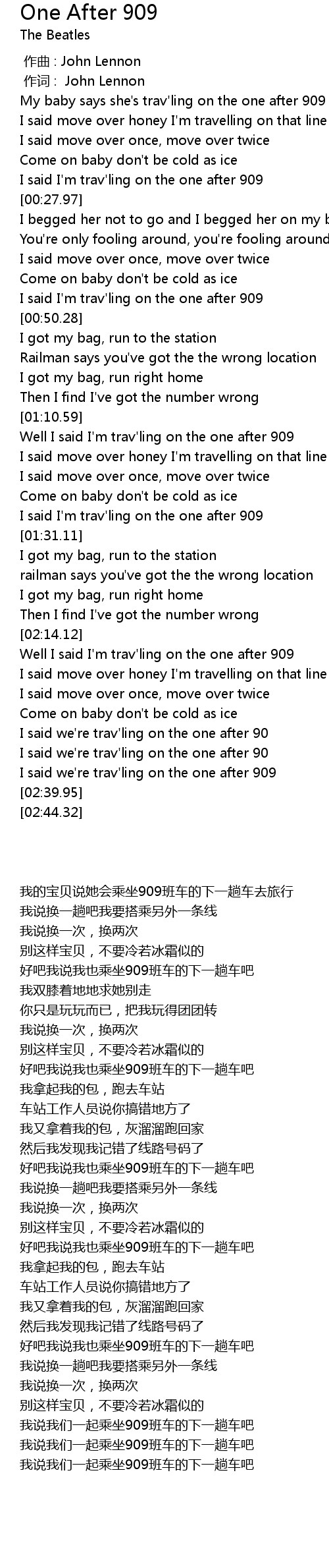 | [00:09.44] | My baby says she's trav'ling on the one after 909 |