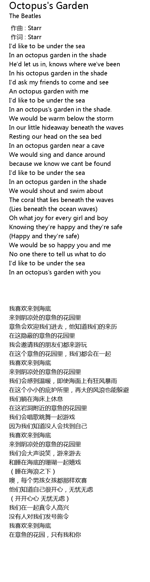 | [00:46.300] | In an octopus' s garden in the shade. |