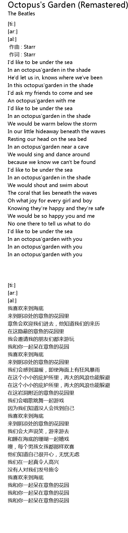 | [00:47.34] | In an octopus' garden in the shade |