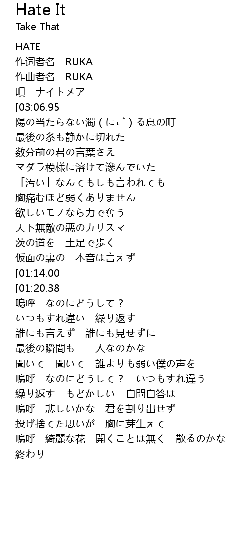 | [02:28.07][01:20.38] | 嗚呼 なのにどうして? 愛を叫べない |