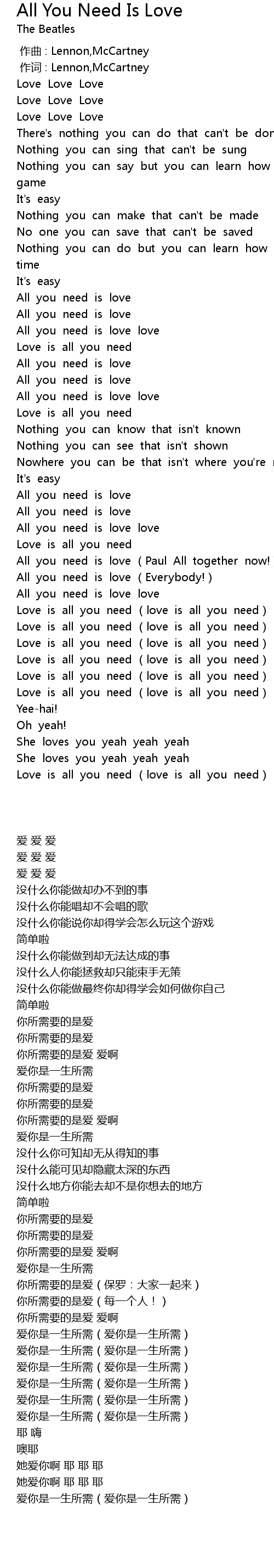 | [02:28.341] | All you need is love (Paul All together now!) |