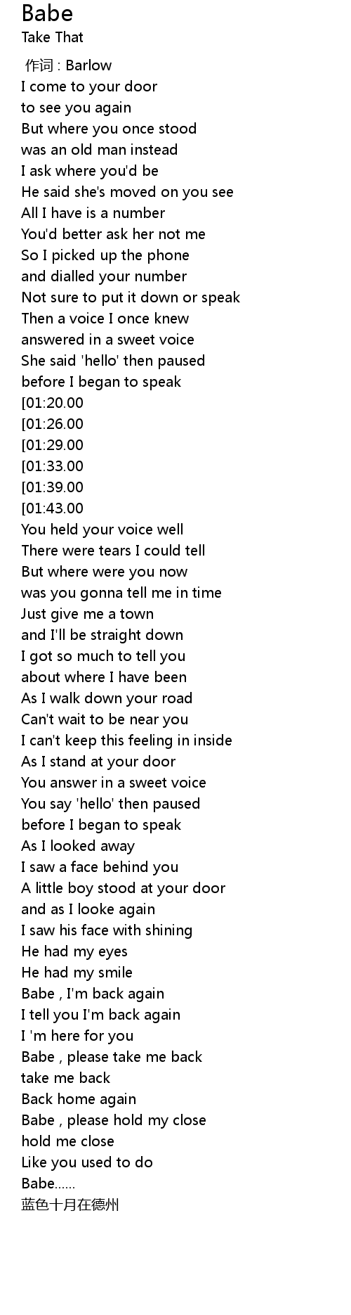 | [02:42.00][01:20.00] | Babe , I' m here again |