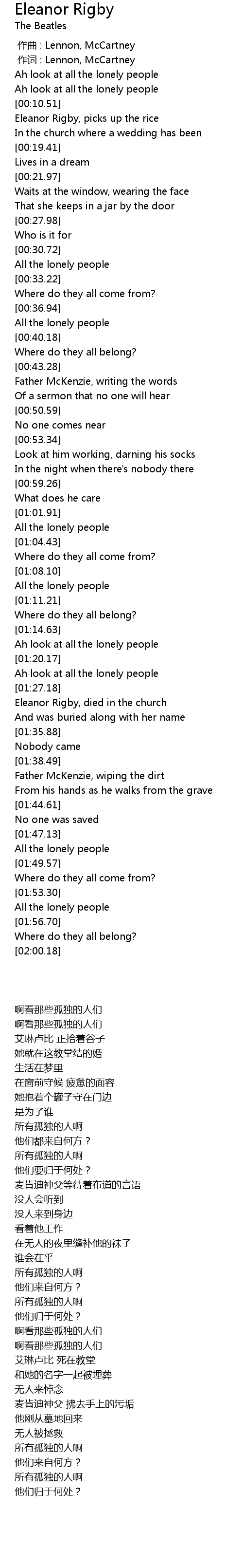 | [01:30.45] | Eleanor Rigby, died in the church |