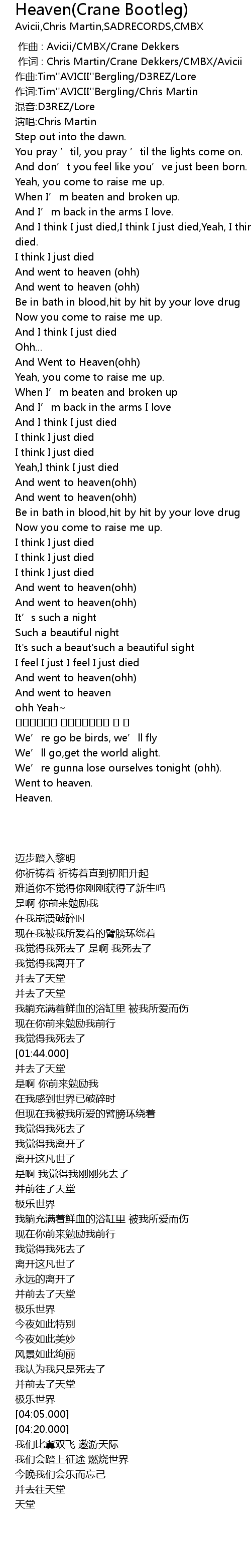 | [00:00.000] | zuò cí : Chris Martin Crane Dekkers CMBX Avicii |