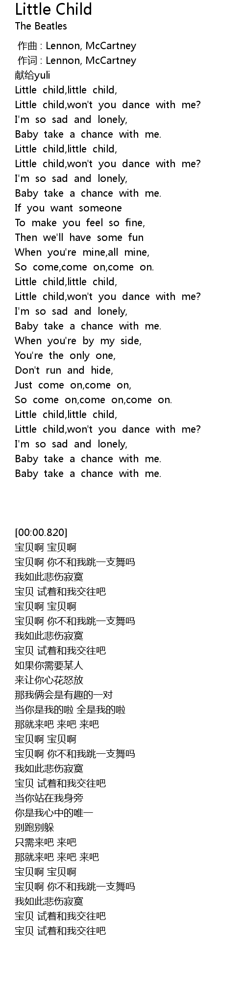 | [00:09.564] | Little child,won't you dance with me? |