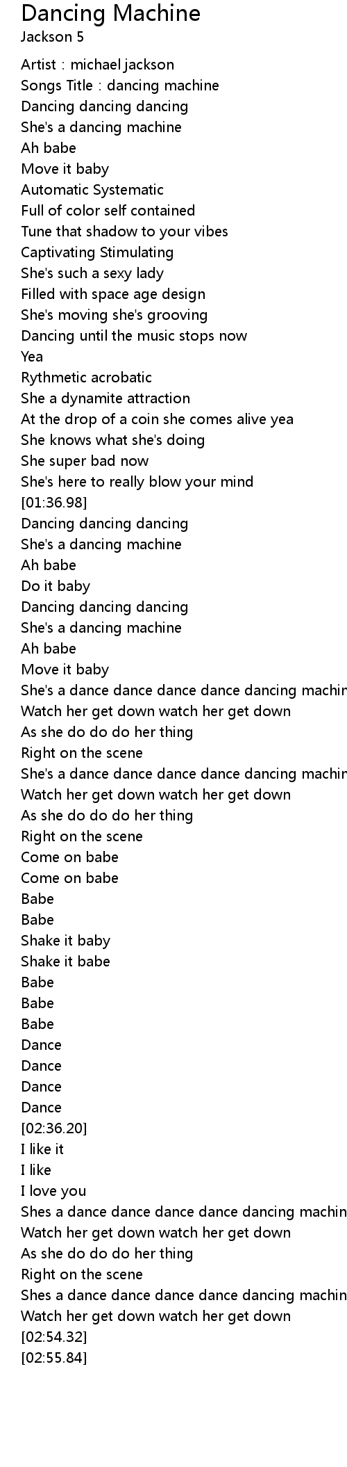 | [01:57.37] | She's a dance dance dance dance dancing machine |