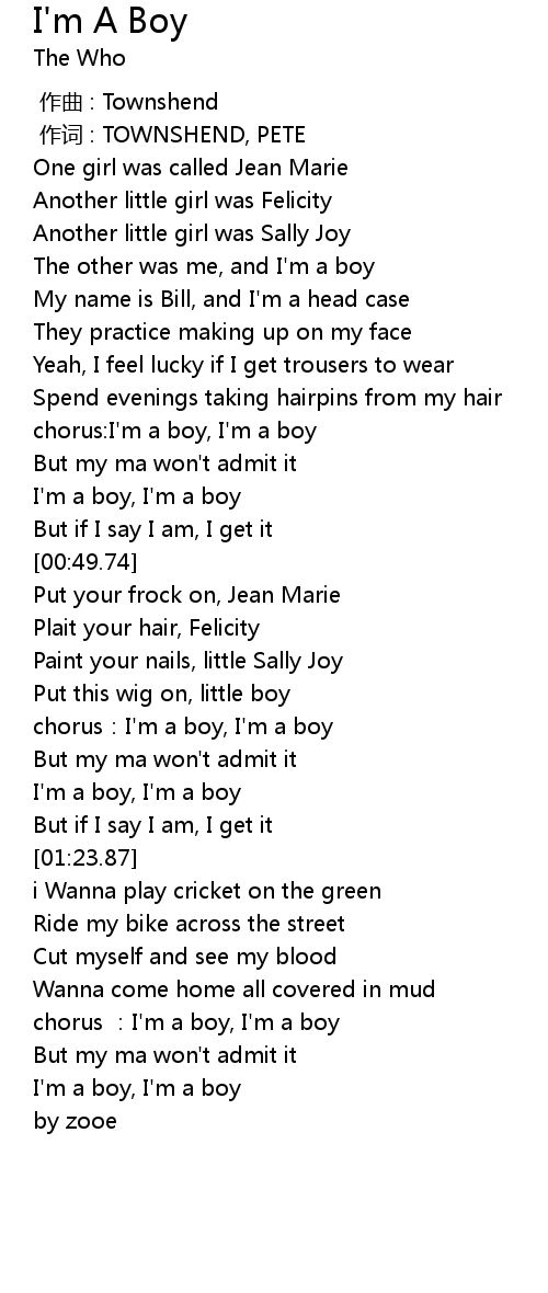 | [02:14.32] | chorus : I' m a boy, I' m a boy |