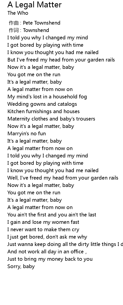 | [00:36.00] | It' s a legal matter, baby |