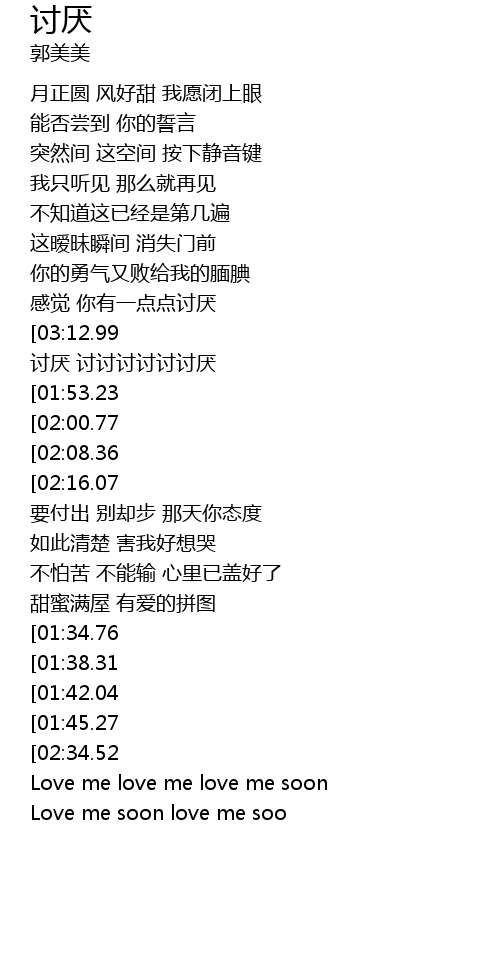 | [03:20.17][03:12.99][03:05.22][02:57.66][02:12.21][02:04.94][01:57.19][01:49.38][01:11.91][01:04.27][00:56.50][00:49.05] | 讨厌 讨厌 讨讨讨讨讨讨厌 |