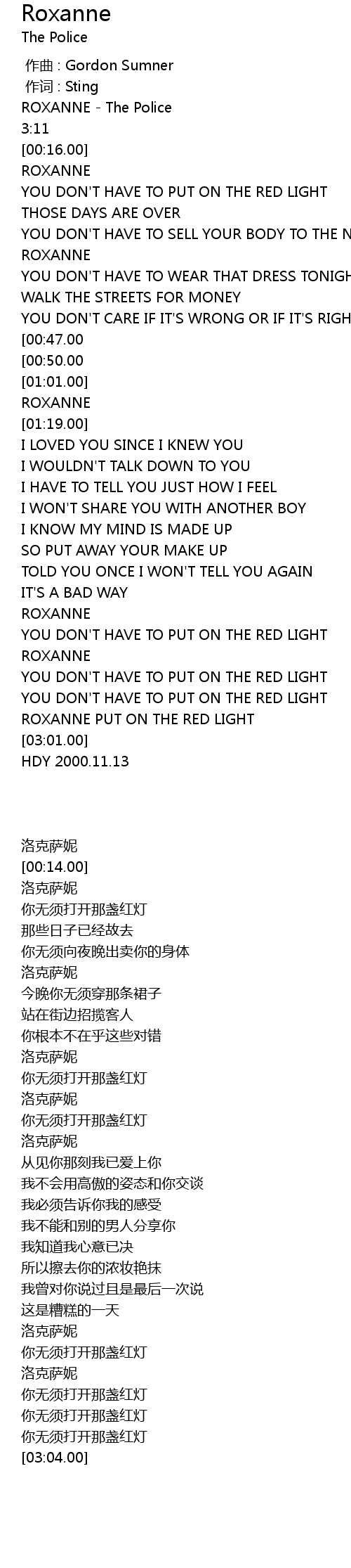 | [02:14.00] | ROXANNE PUT ON THE RED LIGHT |
