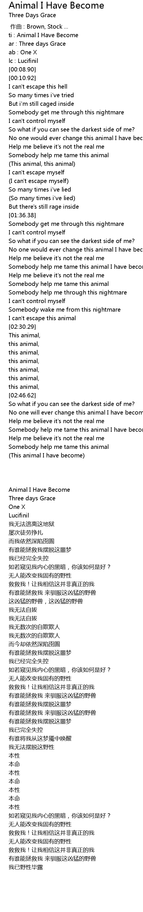 | [02:51.71] | No one will ever change this animal I have become |