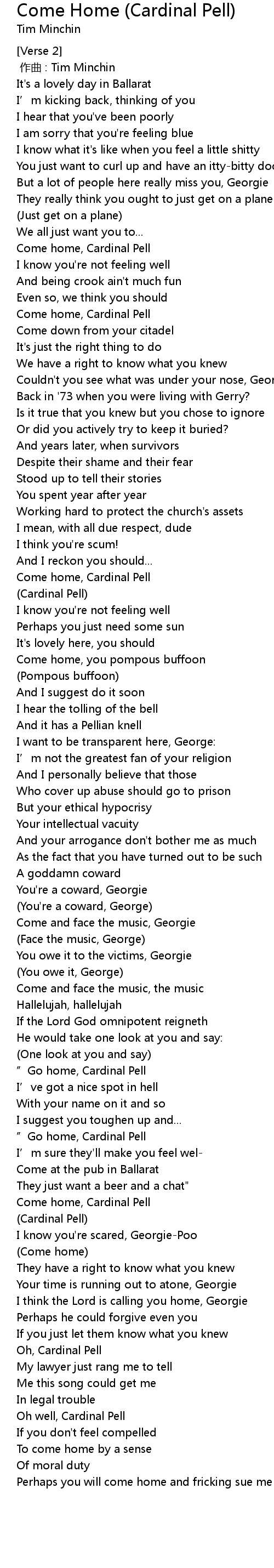 | [01:49.62] | Come home, Cardinal Pell |