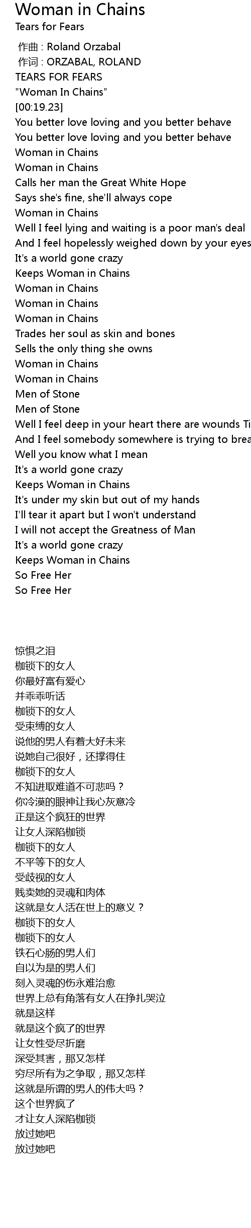 | [00:17.18] | " Woman In Chains" |