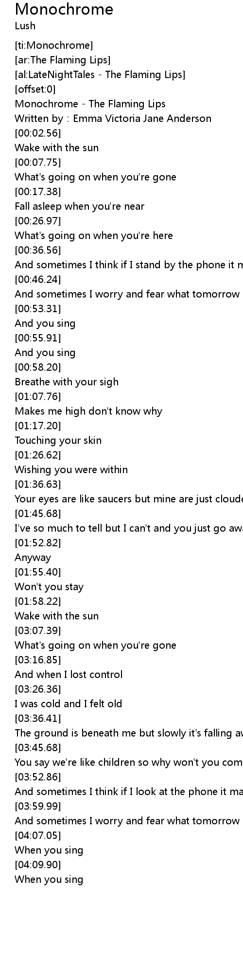 | [00:00.28] | Monochrome - The Flaming Lips |