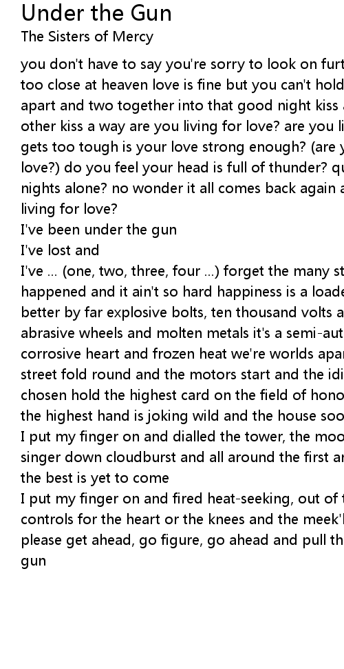 I've ... (one, two, three, four ...) forget the many steps to heaven it never happened and it ain't so hard happiness is a loaded weapon and a short cut is better by far explosive bolts, ten thousand volts at a million miles an hour abrasive wheels and molten metals it's a semi-automatic, get in the car corrosive heart and frozen heat we're worlds apart where we could meet where the street fold round and the motors start and the idiot wields the power where the chosen hold the highest card on the field of honour where the ground is hard so the highest hand is joking wild and the house soon fold and no-one stand |
