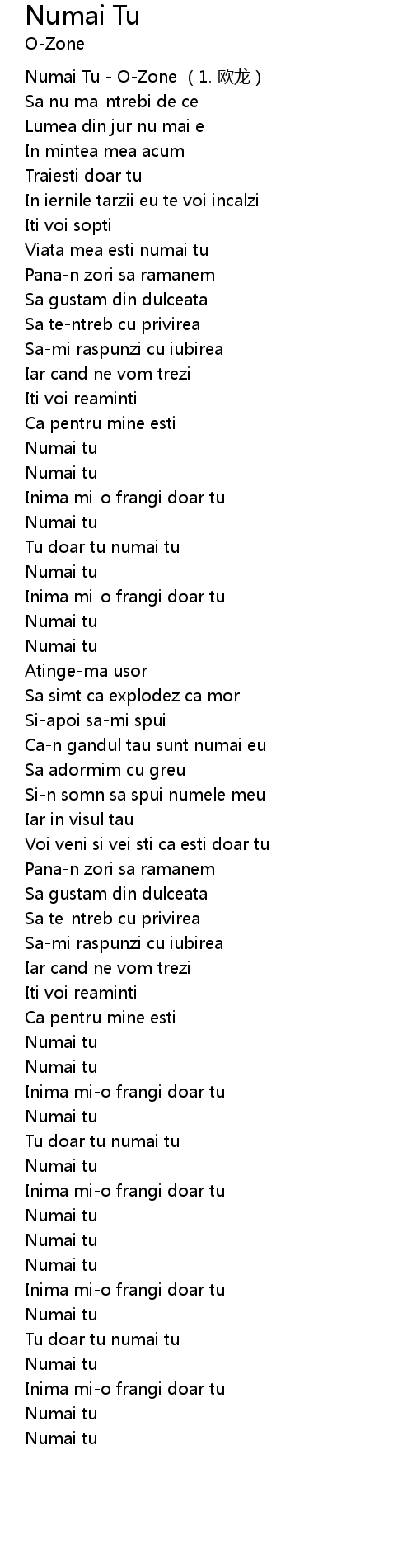 | [00:00.41] | Numai Tu - O-Zone (1. 欧龙) |